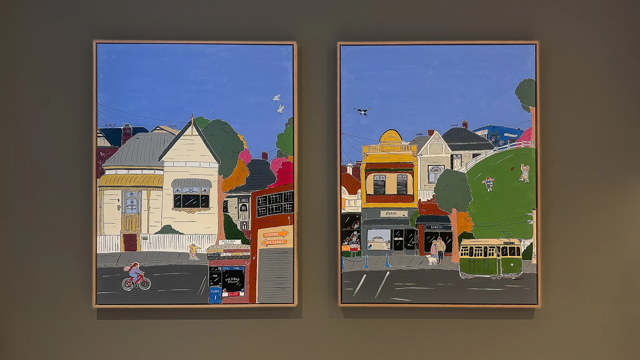 As part of our artist series at Local: Kensington, we worked with Mornington Peninsula-based artist Charlie Nanos, whose playful, nostalgic style brings warmth and story to the everyday. His commissioned artwork features two side-by-side panels depicting the vibrant streetscapes of the Kensington neighbourhood - offering a colourful, character-filled view into the community just outside our doors.