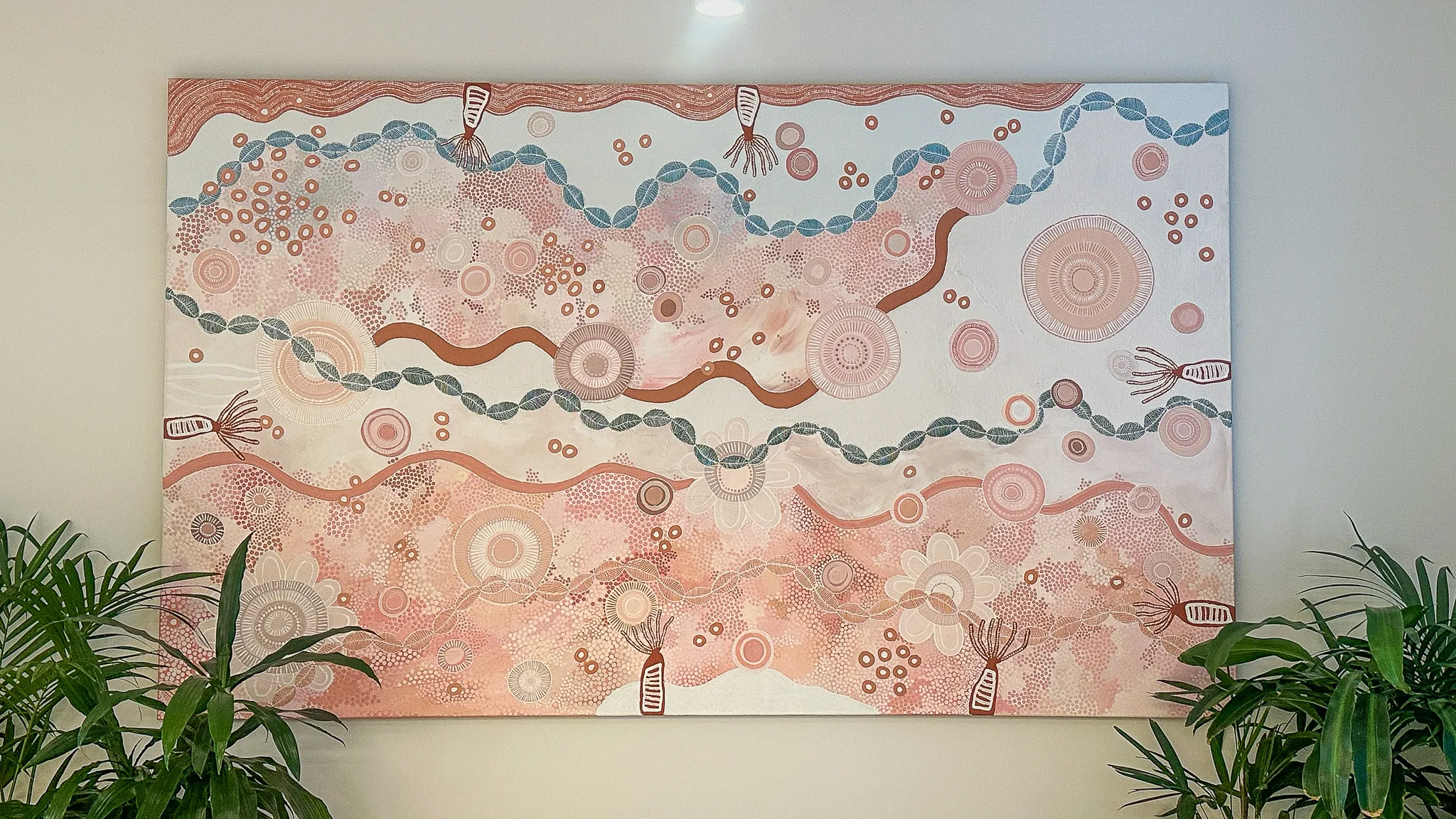 Karen Lee (Mungarrja) is a Wiradjuri artist whose large-format canvases now sit within the Lounge entrance and hallway at Local: Kensington. Her work explores themes of memory, landscape and connection to Country - acknowledging what has come before and what still remains.
